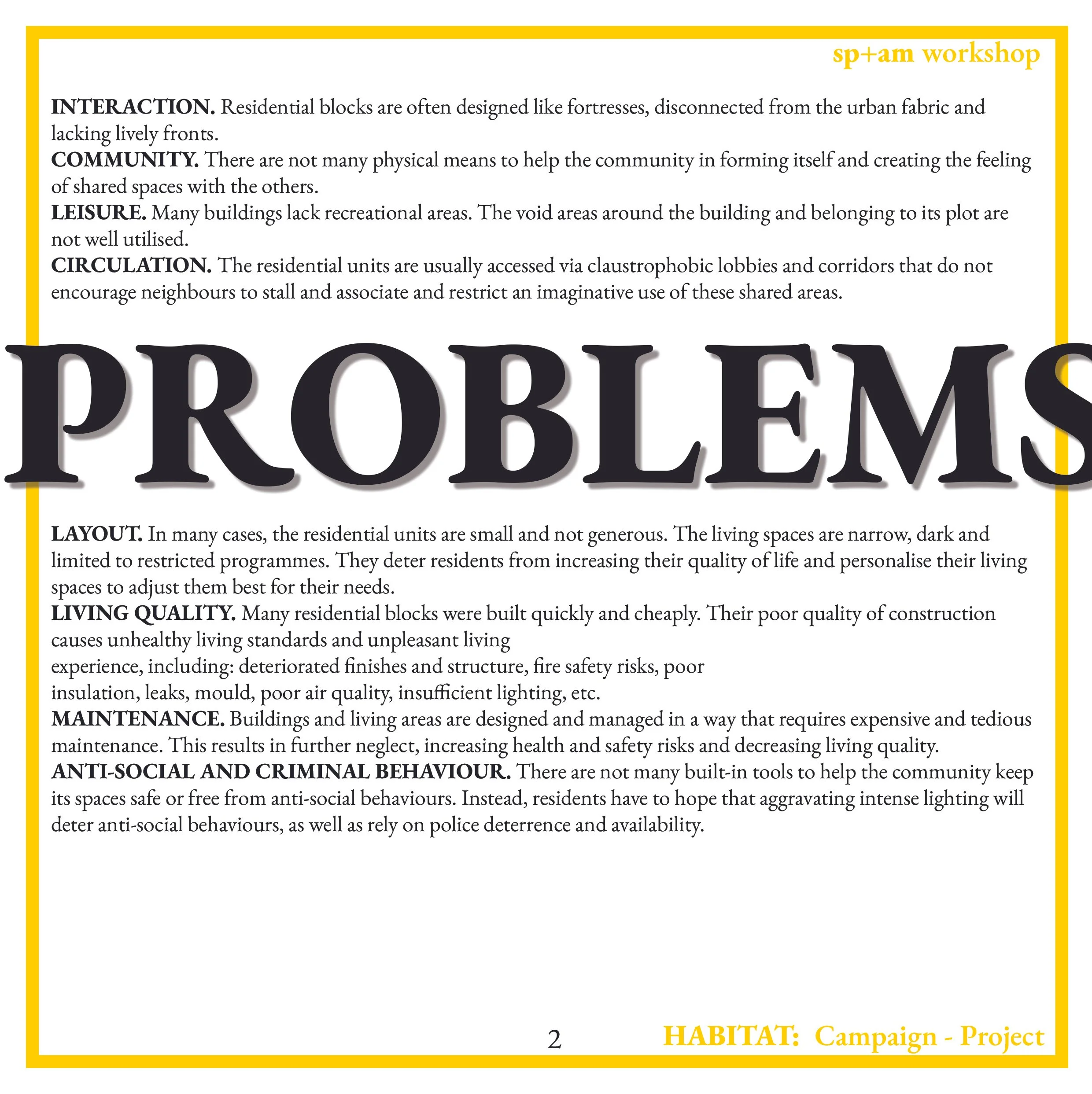 Page showing problems with residential blocks, including issues related to interaction, community, leisure, circulation, layout, living quality, maintenance, and anti-social behavior, with a large overlayed text reading 'PROBLEMS'.