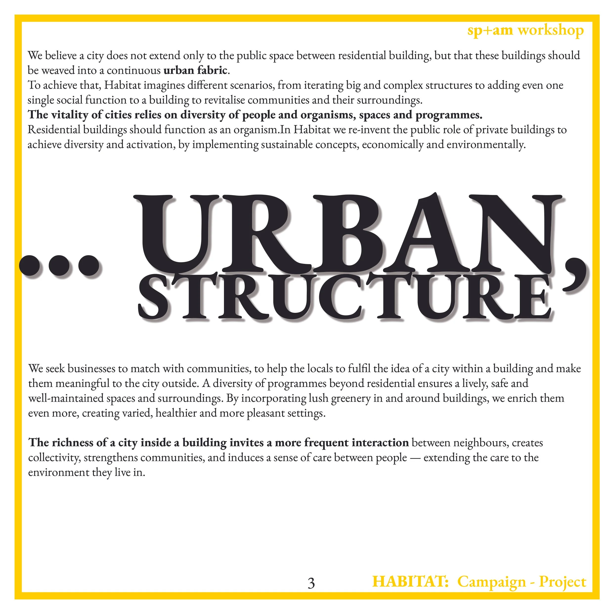Page from a report discussing urban structure, featuring a bright yellow border and yellow header, with large black text reading 'URBAN STRUCTURE' and smaller text about city planning and community interaction.