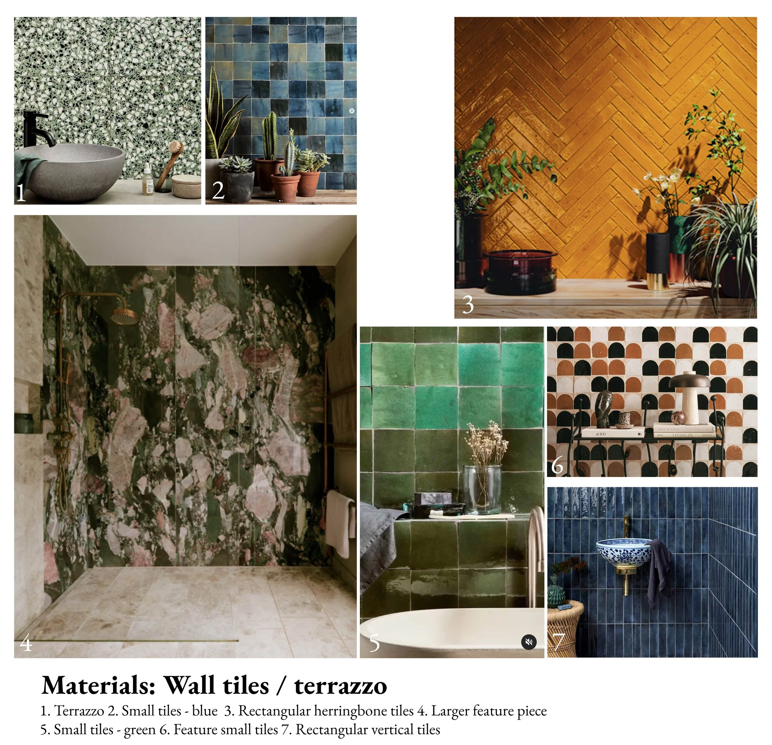 terrazzo, glazed tiles, herringbone patterns in warm earthy tones
