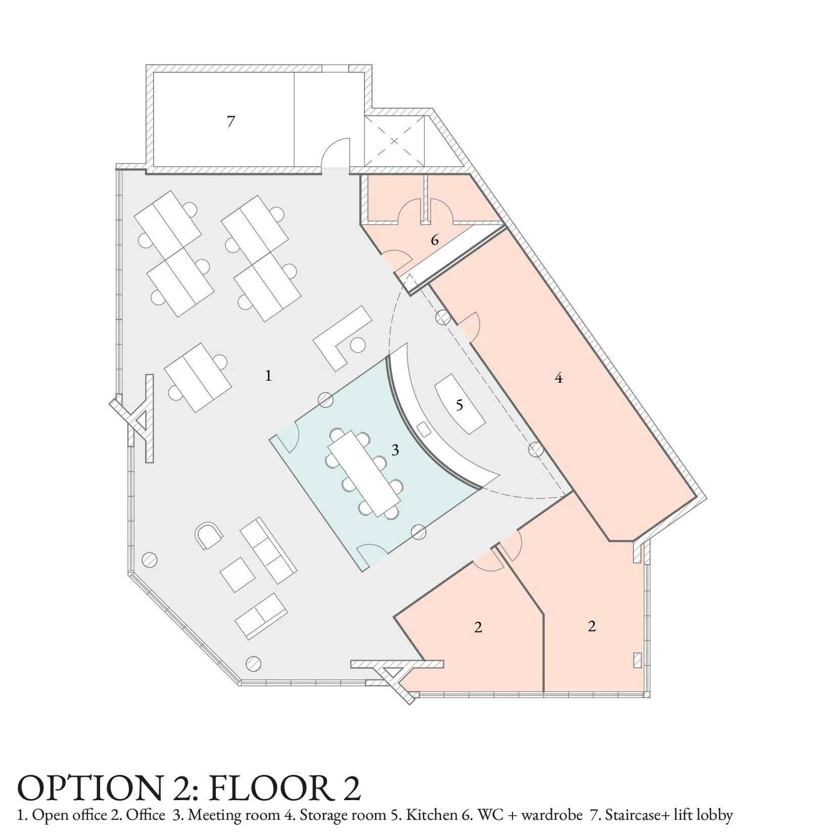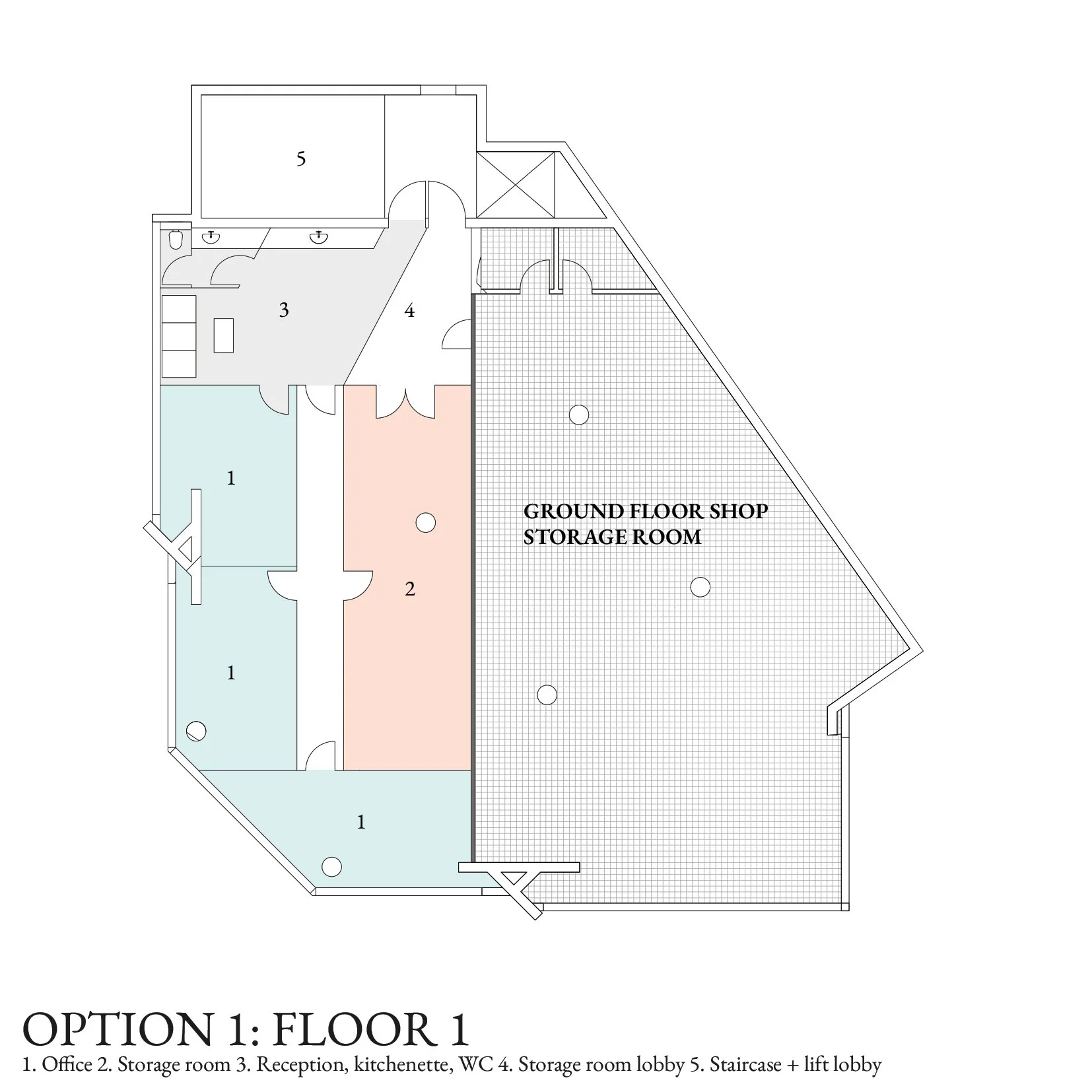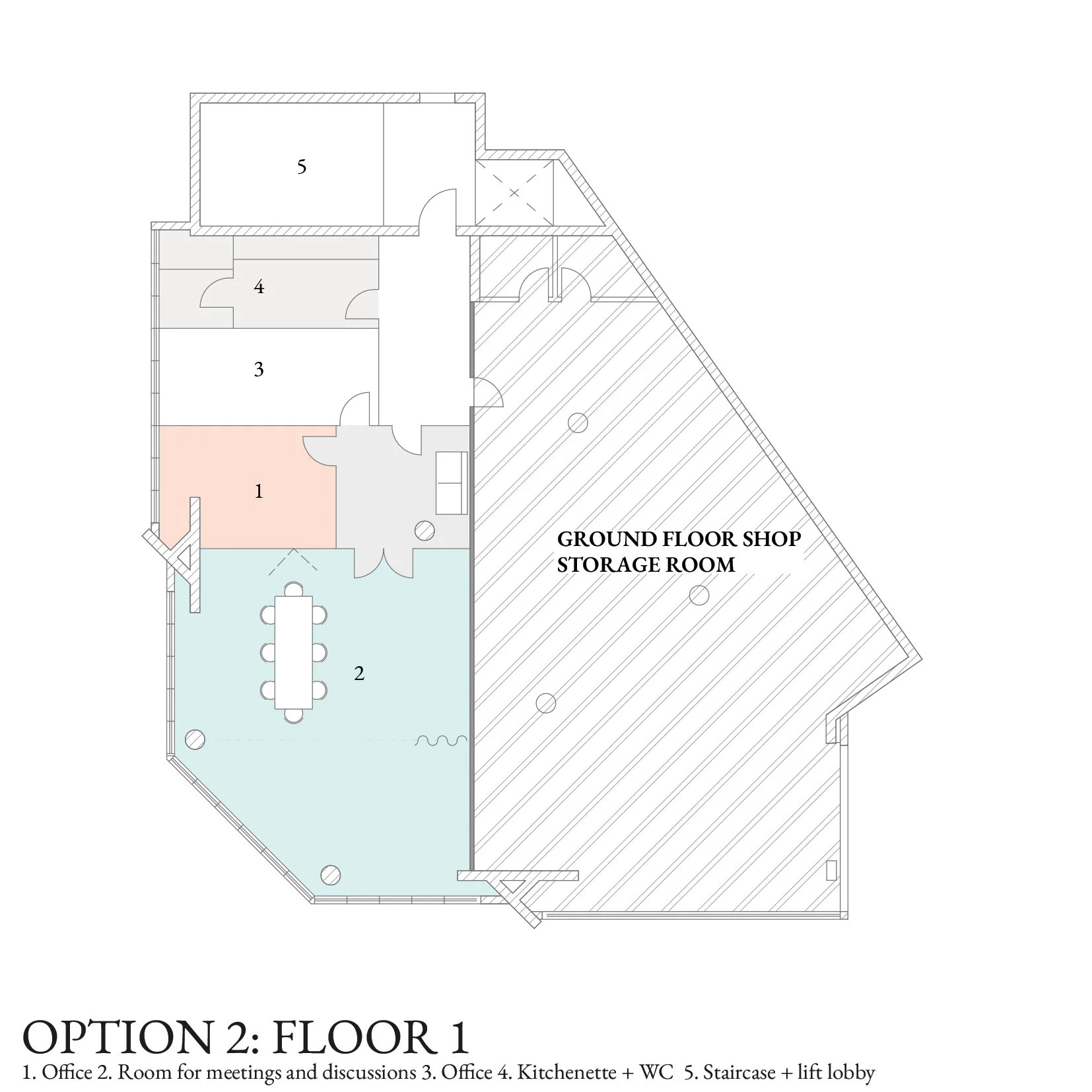 Option 1: A main central piece (in blue) formed of glass walls and timber panelling acts as an island - a space which also hosts the archive of the office. The large meeting room is here proposed on the main office level (Floor 2) suggesting a business shift towards a more socially and well-being related business ethos through lectures, talks and events.