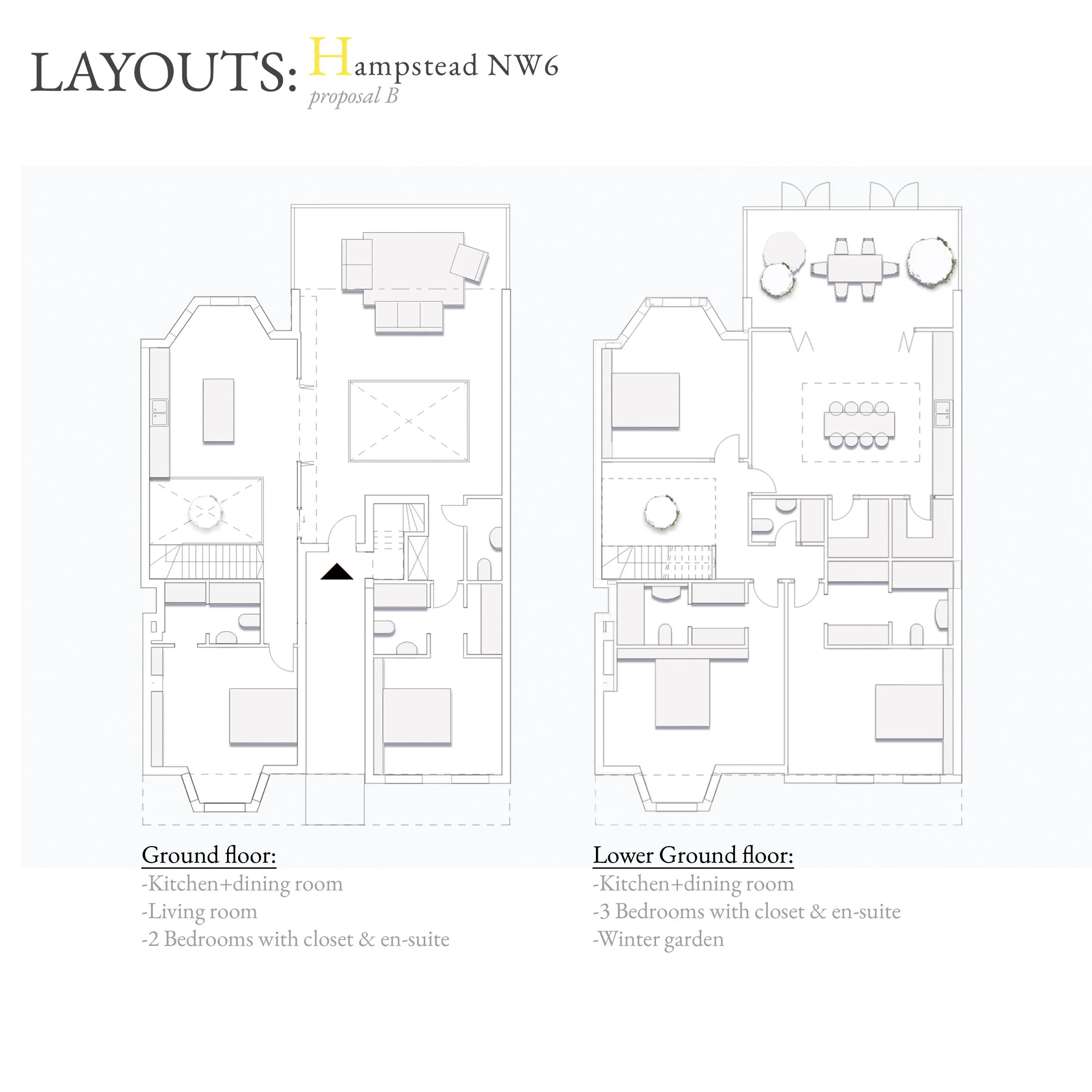 Proposal B: Here the first and the lower ground floor are clearly defined but are connected through a couple of large double-height voids which create more bright and airy environment. A large winter garden on the Lower ground creates a connection between the garden and the dining area.
