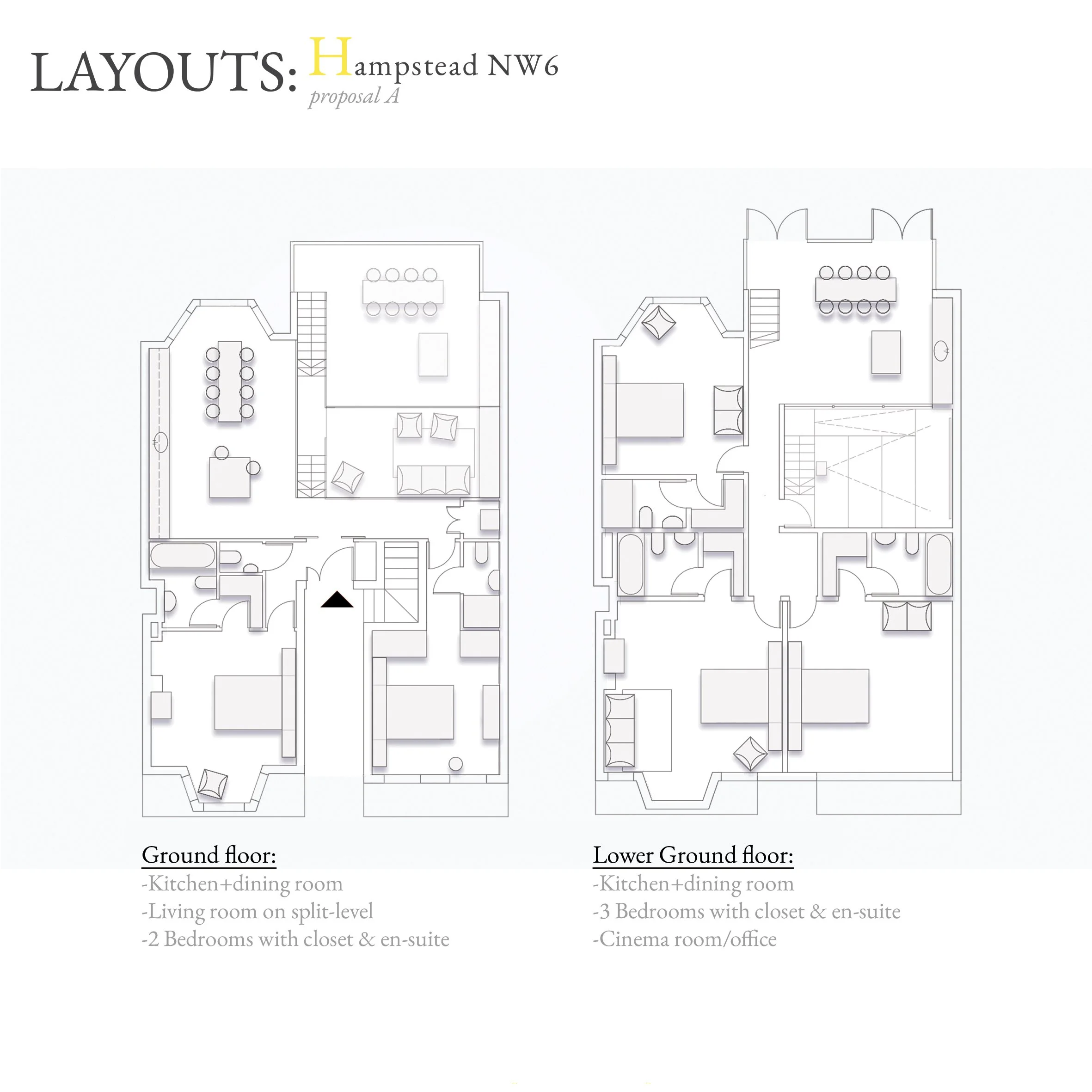 Proposal A: This option introduces a number of stepping down split-levels allowing for perceiving the space as one across the levels and also creating separate groups for various daytime activities. The lower ground benefits of a cinema room or just a space for quiet undisturbed work.